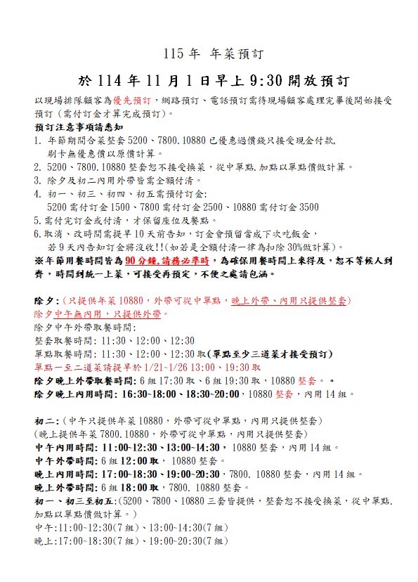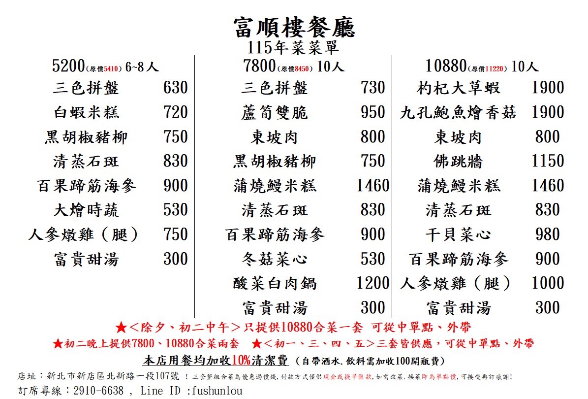 115年 年菜菜單 選單 富順樓合菜 富順樓單點 115年 年菜菜單 114/11/1的早上9:30開始訂,有問題請致電或加賴詢問。 ❗以現場排隊客人為優先,還有位置順位會提供網路賴客人謝謝。 假日用餐客人比較多,訂位及訂年菜請儘量平日來不用久候。 營業時間:11:00-14:00,17:00-21:00 (空班休息時間14:00-17:00請勿前來,請避開此時段感恩) 電話:0229106638 Line:fushunlou
