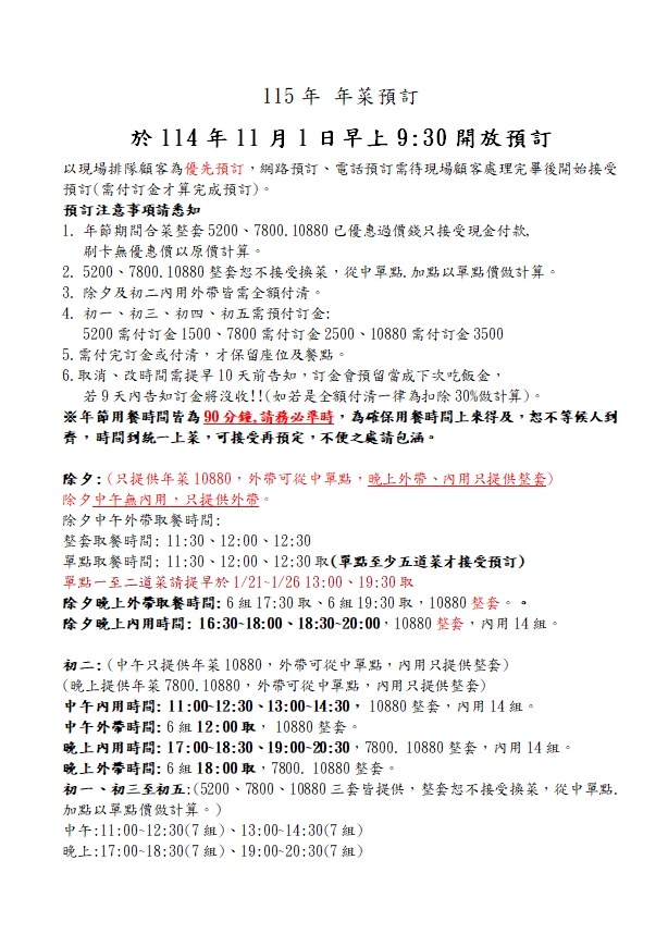 115年 年菜菜單 選單 富順樓合菜 115年母親節精緻合菜菜單 富順樓單點 115年 年菜菜單 114/11/1的早上9:30開始訂,有問題請致電或加賴詢問。 ❗以現場排隊客人為優先,還有位置順位會提供網路賴客人謝謝。(除夕內用已滿) 假日用餐客人比較多,訂位及訂年菜請平日來不用久候,或多加利用加line匯款,我們會回傳單子給您過年取餐當天憑出示畫面訂單取餐即可。 營業時間:11:00-14:00,17:00-21:00 (空班休息時間14:00-17:00請勿前來,請避開此時段感恩) 電話:0229106638 Line:fushunlou